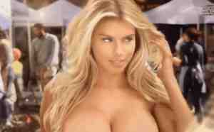 naked as she walks through a farmer's market. This is as close to complete nudity as you can get because she appears to be nude until the end when she is in full view wearing a string bikini top and tiny shorts while eating a hamburger from Carl's Jr.