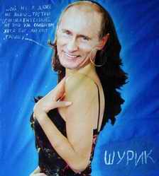 Painter Alexander Shednov, also known as Shurik, portrayed the former president in a low-cut dress with long hair and large hoop