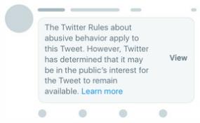 this in mind, there are certain cases where it may be in the public's interest to have access to certain Tweets, even if they would otherwise be in violation of our rules. On the rare occasions when this happens, we'll place a notice -- a screen you have