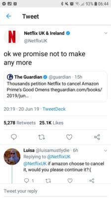 About 20,000 people in the US have signed a petition calling for the cancellation of Good Omens , the television series adapted from Terry Pratchett and Neil Gaiman's 1990 fantasy novel. Unfortunately they addressed their petition to Netflix when